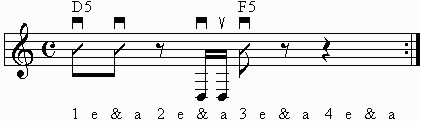 Next we will add an F power chord on the downbeat of beat 3. Your F power chord will be on your 3rd fret. Bar a finger across all 3 strings.
